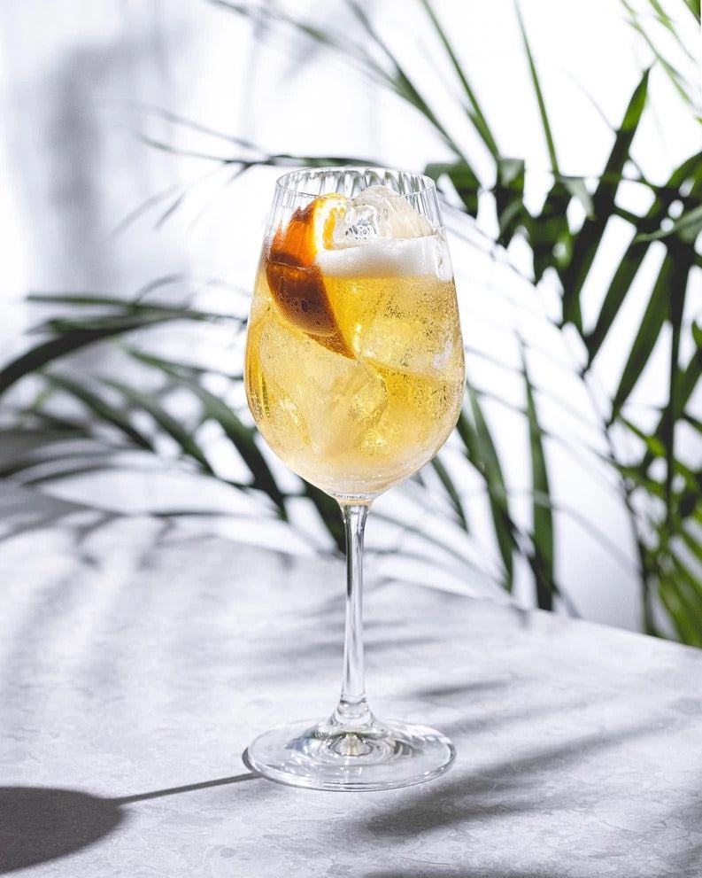 Build all ingredients over cubed or hand cracked ice in a wine glass, and stir gently to combine.