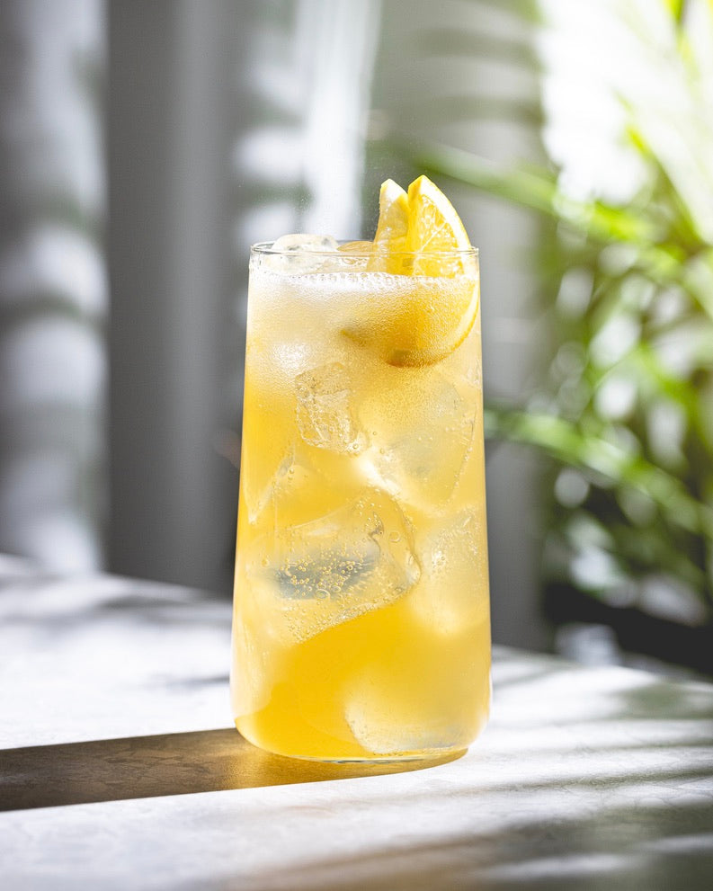 Add al ingredients to a highball glass with large cubed ice, and stir gently to combine. Top with more ice, garnish and serve.